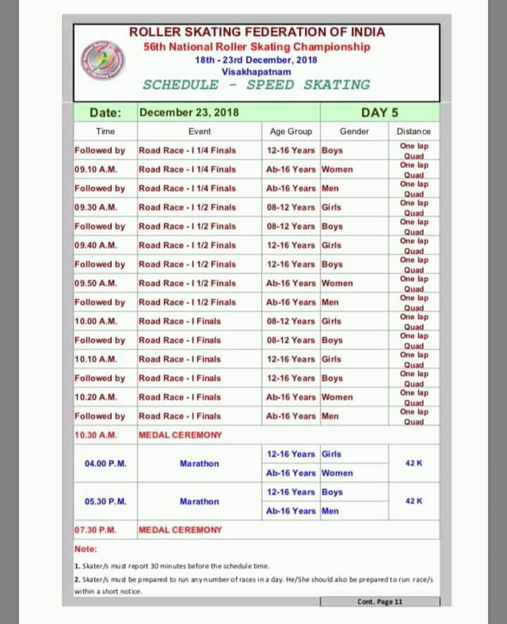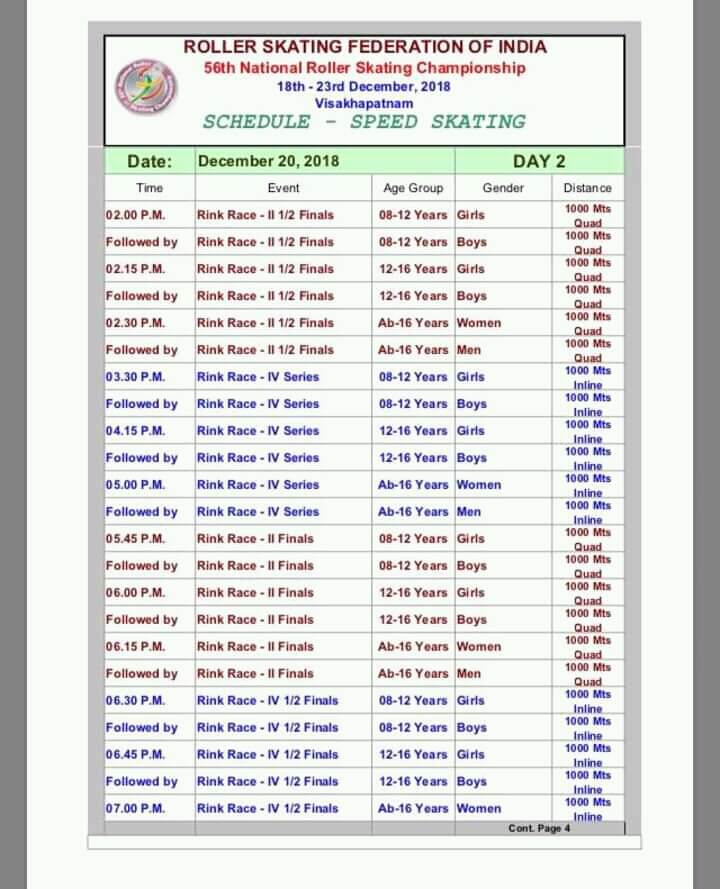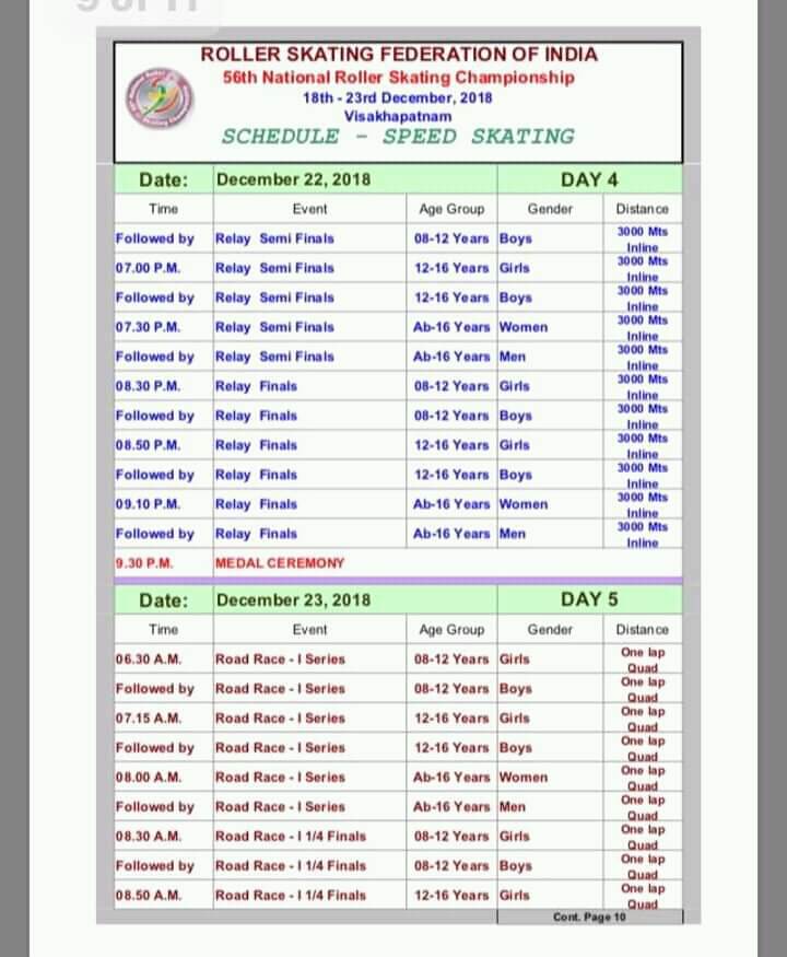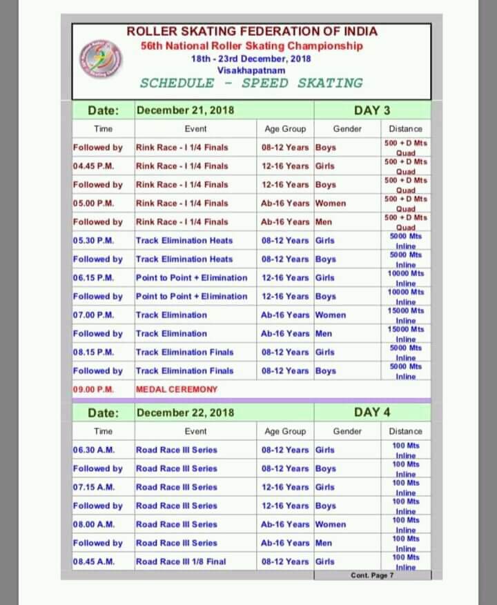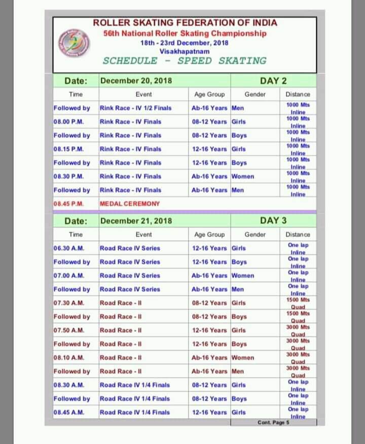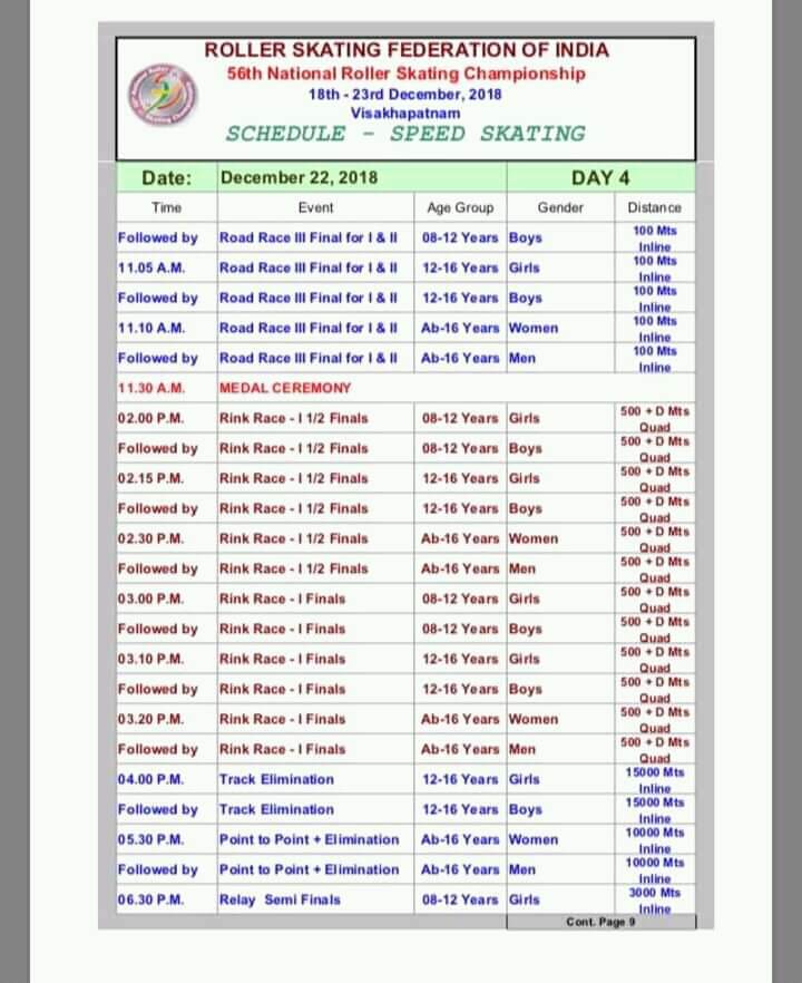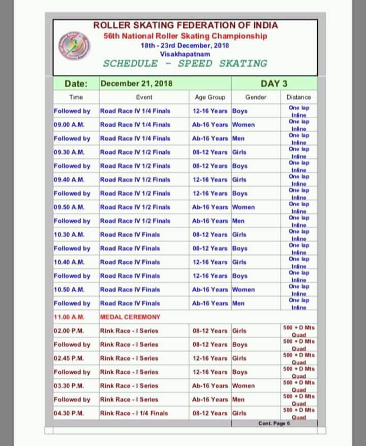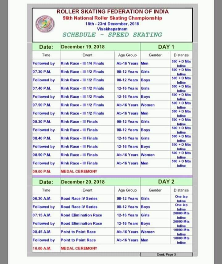 Schedule of 56th National Open Roller Skating Competition 2018 to be held at Visakhapatnam from 18th December to 23rd December 2018